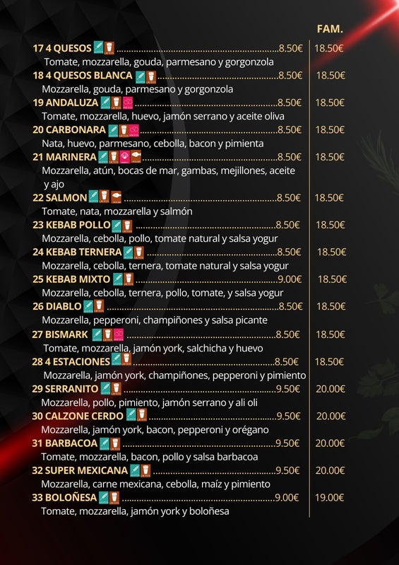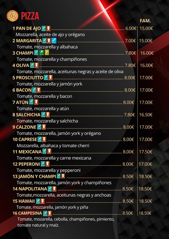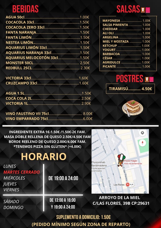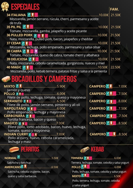 Descubre la magia de Pizzamagic.com a través de nuestro variado menú. Encontrarás una gran selección de pizzas, bocadillos, camperos, hamburguesas y kebabs, todos elaborados con ingredientes de primera calidad. ¡Te invitamos a explorar cada plato y encontrar tu favorito!